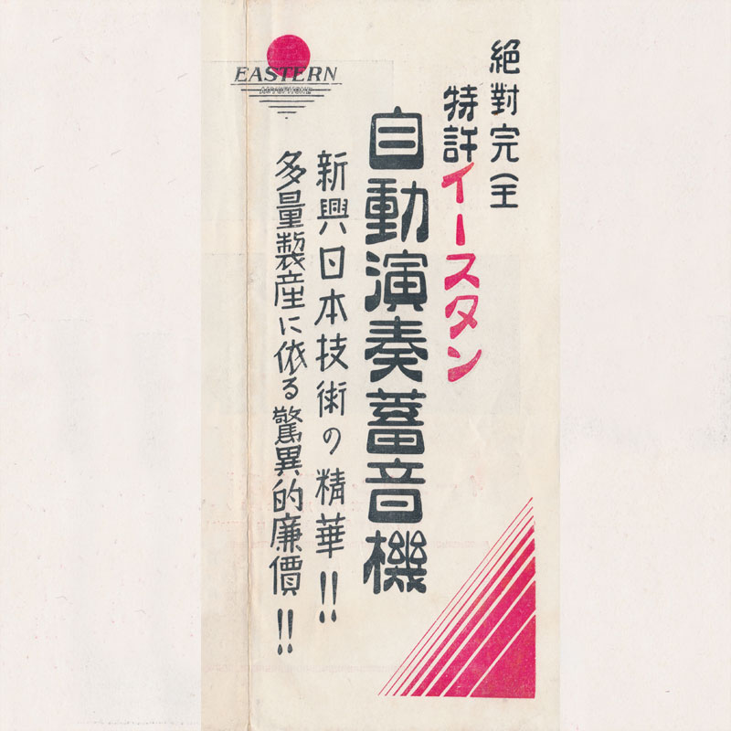 レコードが終わった!! それ蓄音器!! と掛ける人は勿論、聴いている人にも忙しい気分を与える時代は去りました。ご想像下さい、締め切った函から次々に思い通りの順序で音楽が流れ出る快感を!! 故障続出にかてて加えて高価のために満たされなかった自動蓄音機への渇望は、イースタンB型によって解決されました。本気は十ヶ年に亘る貴い研究の結晶であり二ヶ年前の誕生以来東京に於いて試売の結果、機械は絶対完全で御売商用の比較的荒い御使用に充分耐えましたので、愈々確固たる自信を持って地方発売を開始致しました。而も此の素晴らしい性能機が整備した工場の多量生産に依って不完全な舶来品の十分の一の価格でご入手できます。ピックアップは日本の誇るべきM.Kマグネットと独特な熱処理に依るアーマチュアとで驚くべき出力と理想的な特性を持っております。外観は優美な黒のベークライトと、青白く光るクローム鍍金との絶好のコントラストで、工芸美術品の品格を備えております。