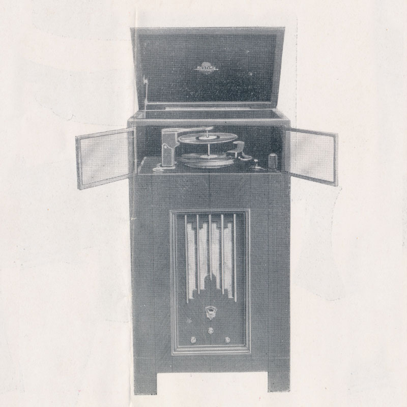 尖端的で大胆に迄斬新なデザインは、時代の動向をさえ示しております。チークの柾材をよく生かして、絶対的なものとしております。前扉は細縁の面取りガラス入り、塗も亦モダーンな淡黄色で、極上ラッカー仕上げです。恂に新鋭自動蓄音機にふさわしいもので、洋室、カフェー、喫茶店向きとして絶好と存じます。