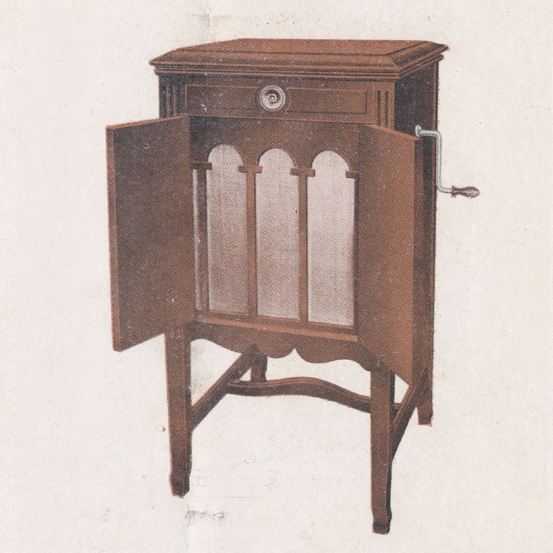 マーヴェル蓄音器として始めて世の中へ出たのが此の190号型でありまして其超蓄音器的な優れた音色に依って多くの人々は全く驚かされたのであります。現在本号から更に本カタログ記載の6種がうまれた訳で言わば本品は其最初の標準的型式であって、従ってマーヴェルの音色音量の特質を最も遺憾なく発揮しているものとも言えます。キャビネットはダークマホガニー仕上両扉付で扉を開けば美しい紗織の絹幕は芸術家の姿をかくすカーテンのように意味深げに張られてあり、其奥から流れ出る音色の如何に微妙であるか……聞く人はおそらく一度で心を刳られるでありましょう。名曲の鑑賞にはこれなくては叶わぬと言われた逸品でございます。