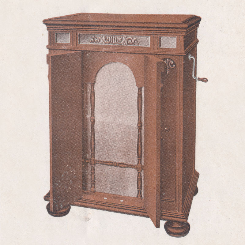 マーヴェル最高の製品でありまして堂々3平方尺に亘るラッパ口から流れ出る音の如何に荘厳で芸術味が溢れているか……本品御所有者は永久に限りない音楽の楽園に遊び東西古今の大芸術家に呼びかけることのできる幸福を感じられるのでありましょう。そして渋く精巧を極めた古典的の彫刻を施したダークマホガニーの落ち着いた外装と金色燦爛たる音管、同回転盤其の他の金具との対照の妙に至っては嘆賞に辞なく、応接室に広間に、集合書に講堂に本品の1台は如何に精彩を添え品位を高めることでありましょう。個人用としても多衆用としても備わらざるなき最高の機械であり又理想的の市なであります。